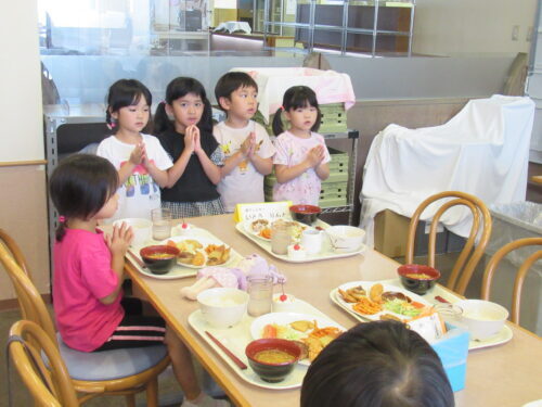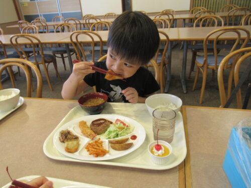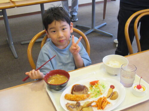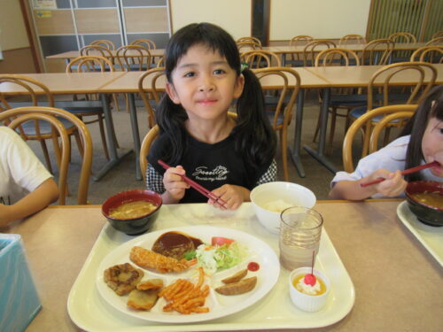 お当番さんダッシュで「いただきます!!!」メニューはこちら♪ 大人と同じボリューム♪これを完食しないさいってなったら…中学・高校運動部の厳しい合宿になってしまうので…好きなものを好きなように食べてもらいました💕どれから…いただきましょうか✨さすがにデザートから食べる強者は出現せず…