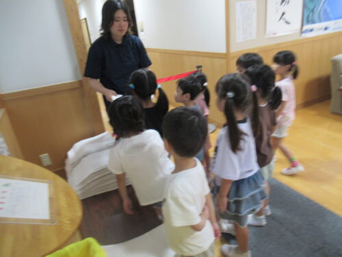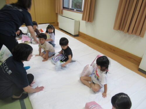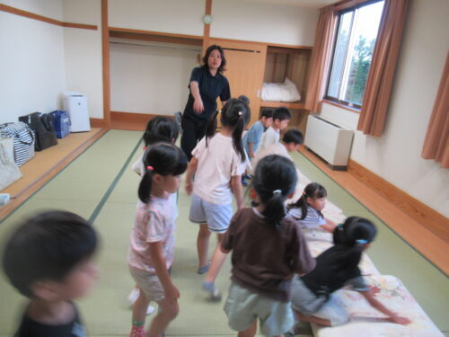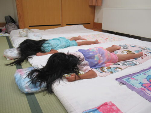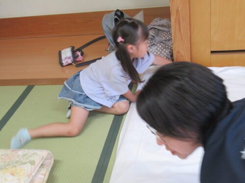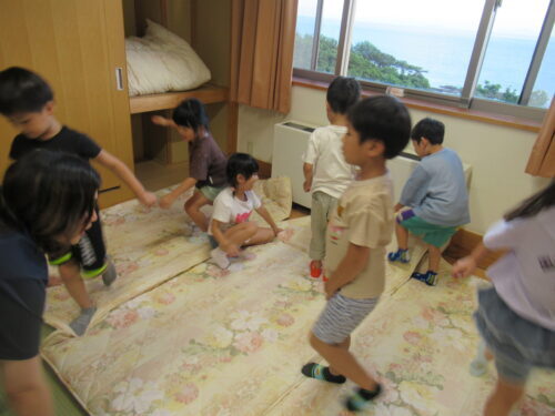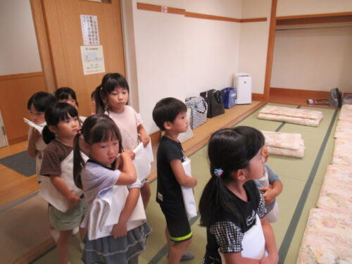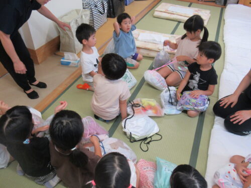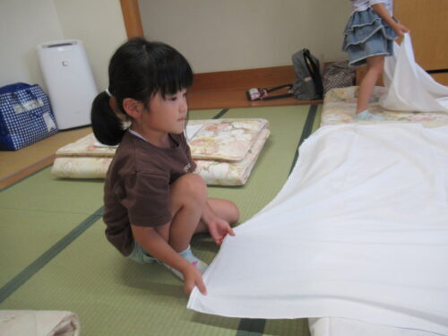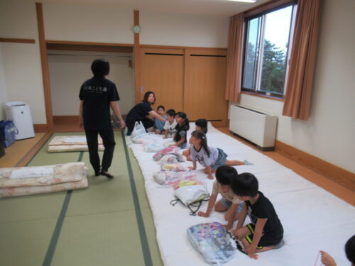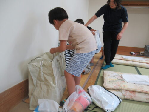 大事そうに受け取ります✨ さぁーっここは協力し合って…頑張って💕 この作業は圧倒的に女児の方が戦力になりました💕寝床完成✨✨✨ 次はお風呂!!!風呂道具・着替え…ちゃんともちましたか?はーいって こんなに持ち物に差があるの… この後(風呂上がりに)…反省組でました💦 ※このような反省を積み重ねて人は成長していくのでしょう♪寝る位置をみんなで決めて…