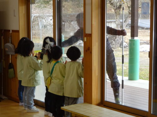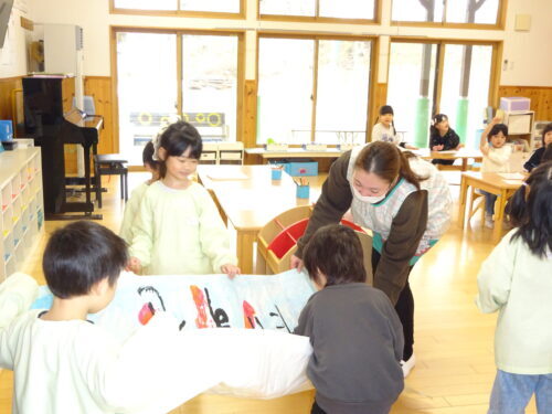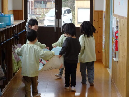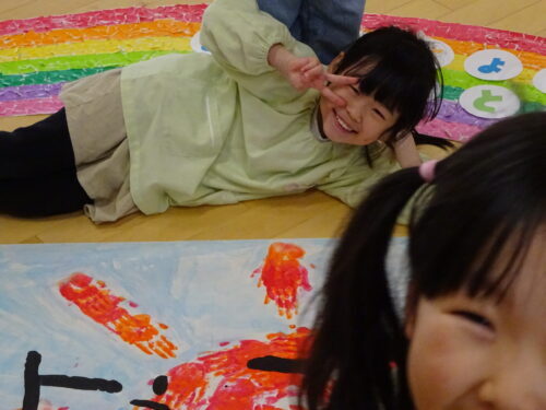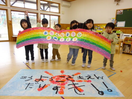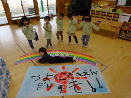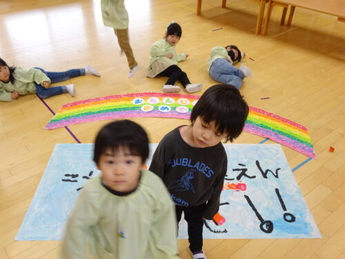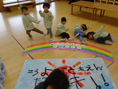 昨年度(R6年度)の青組さんから受け継いだ「虹」と「こうようこどもえんだいすき」を、明日から過ごす青組の部屋に持っていきたい!